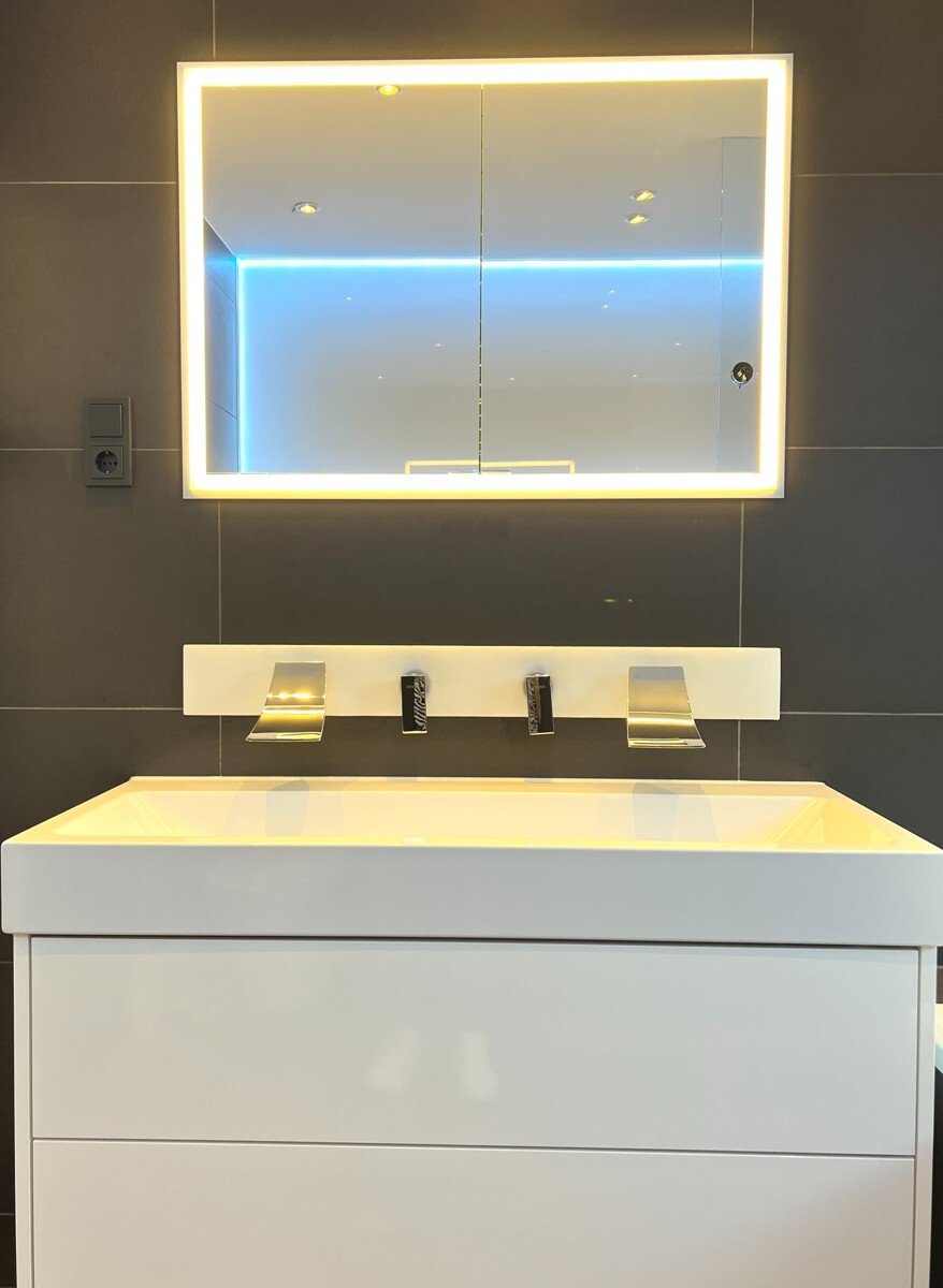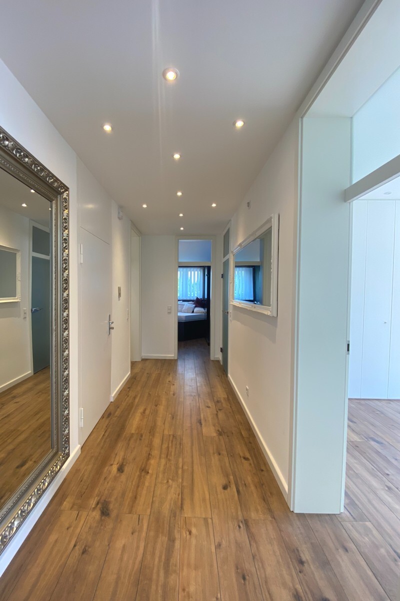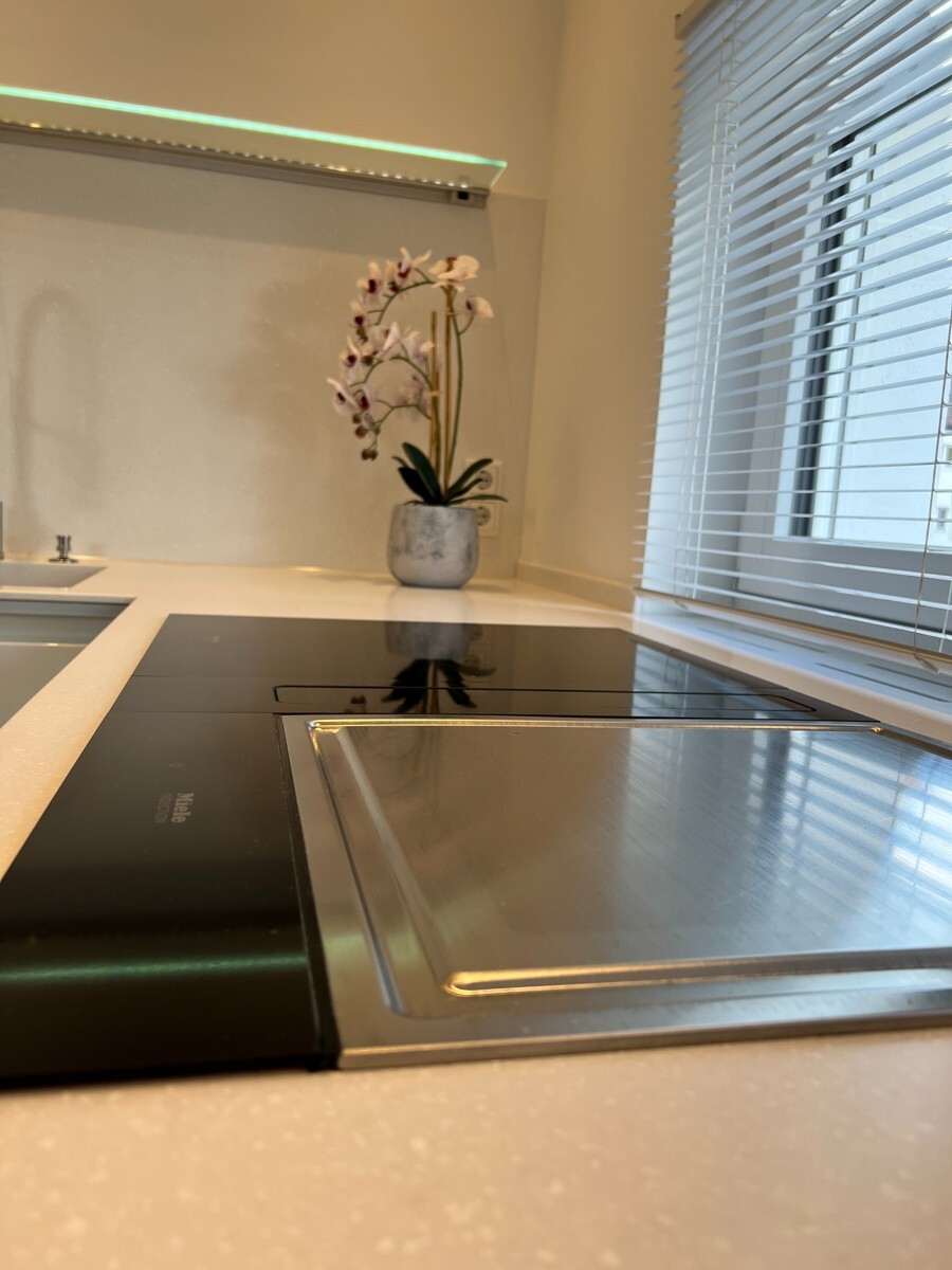 Ein Highlight der Wohnung ist die großzügige Wohnküche mit viel Stauraum, hochwertigen Elektrogeräten sowie exklusiven Ausstattungsdetails wie Dampfgarer, Induktionsherd und Teppanyaki-Grill. Das exklusive Tageslichtbad verfügt über eine Eckbadewanne, eine großzügige Dusche mit Rainshower, einen Doppelwaschtisch mit Designarmaturen sowie einen beleuchteten Einbauspiegelschrank. Ergänzt wird dies durch ein separates Gäste-WC.