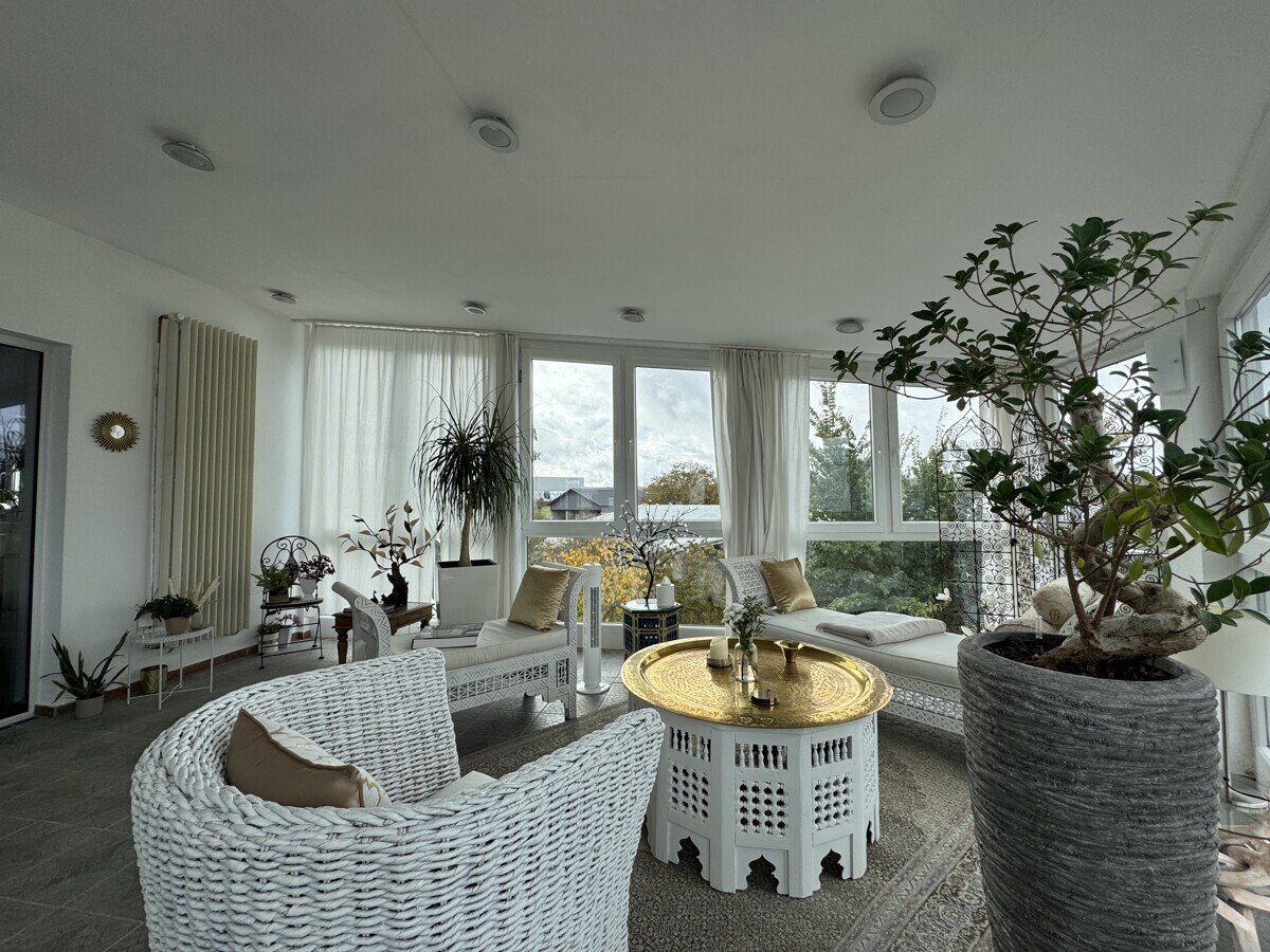 Mehrere Aufenthaltsmöglichkeiten im Haus – vom gemütlichen Wohnbereich bis zum lichtdurchfluteten Wintergarten – schaffen Raum für Entspannung, Begegnung oder Rückzug. Zwei Bäder mit geschmackvoller Ausstattung sorgen für Komfort und Eleganz. Ein Gästebereich bietet Privatsphäre für Besucher oder die Möglichkeit, Wohnen und Arbeiten geschickt zu verbinden.